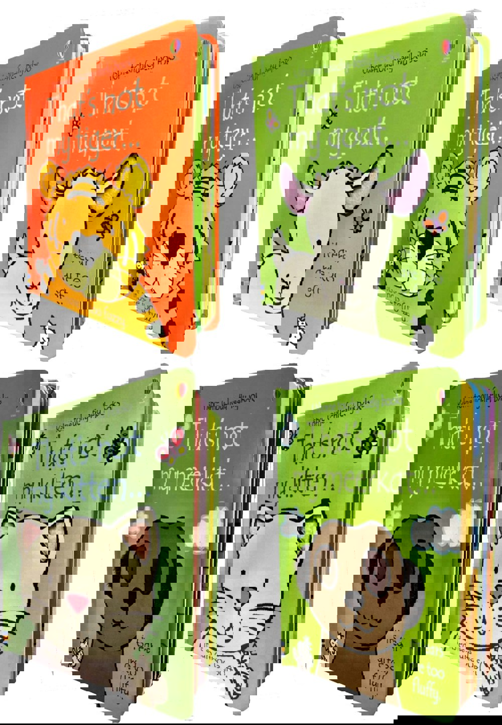 Thats Not My Touchy-Feely Collection is a four-book set that combines four titles under one collection name. It brings together Thats Not My Kitten, Thats Not My Goat, Thats Not My Tiger and Thats Not My Meerkat in a single grouped set.