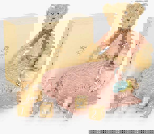 A softly knitted blanket helps keep baby warm and cosy, while a colourful wooden rattle adds a simple way to keep little ones entertained. For cuddles, there is an adorable teddy bear dressed in a knitted jumper, and to help mark those early memories, the set also includes wooden milestone blocks. Personalisation is completed after purchase, with the name collected via email.