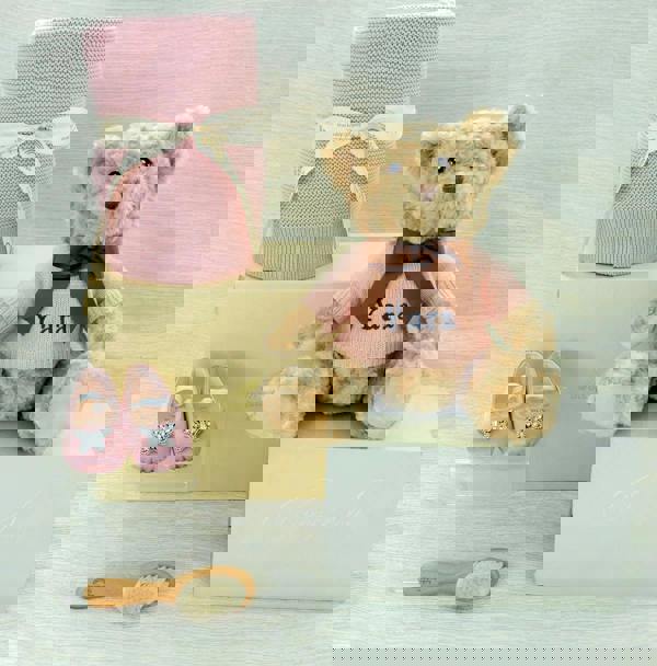 Inside, you’ll find Aruna Seth Blush Pink Satin Odette Baby Shoes alongside one of The Baby Gifting Company’s best-selling super soft 100% organic cotton (GOTS) blankets, plus a classic teddy bear and a keepsake natural hairbrush. Each item is selected for its quality and sentiment, making the set a meaningful choice for celebrating a new arrival.