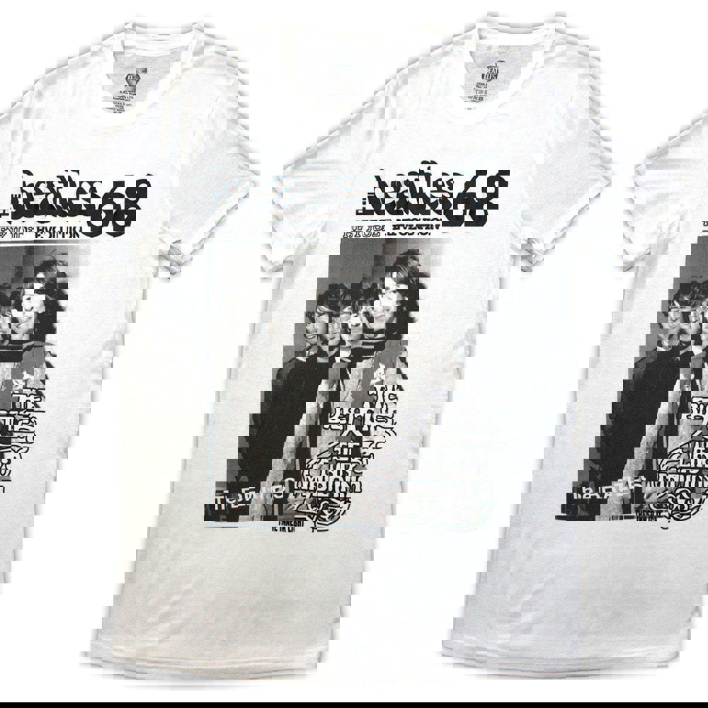 Official licensed The Beatles Unisex T-Shirt featuring the '1968' design motif. High quality white unisex t-shirt featuring front printed motifs. Comes in a wide range of sizes from XX-Small through XX-Large, subject to availability.