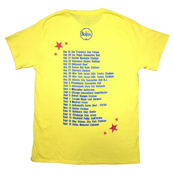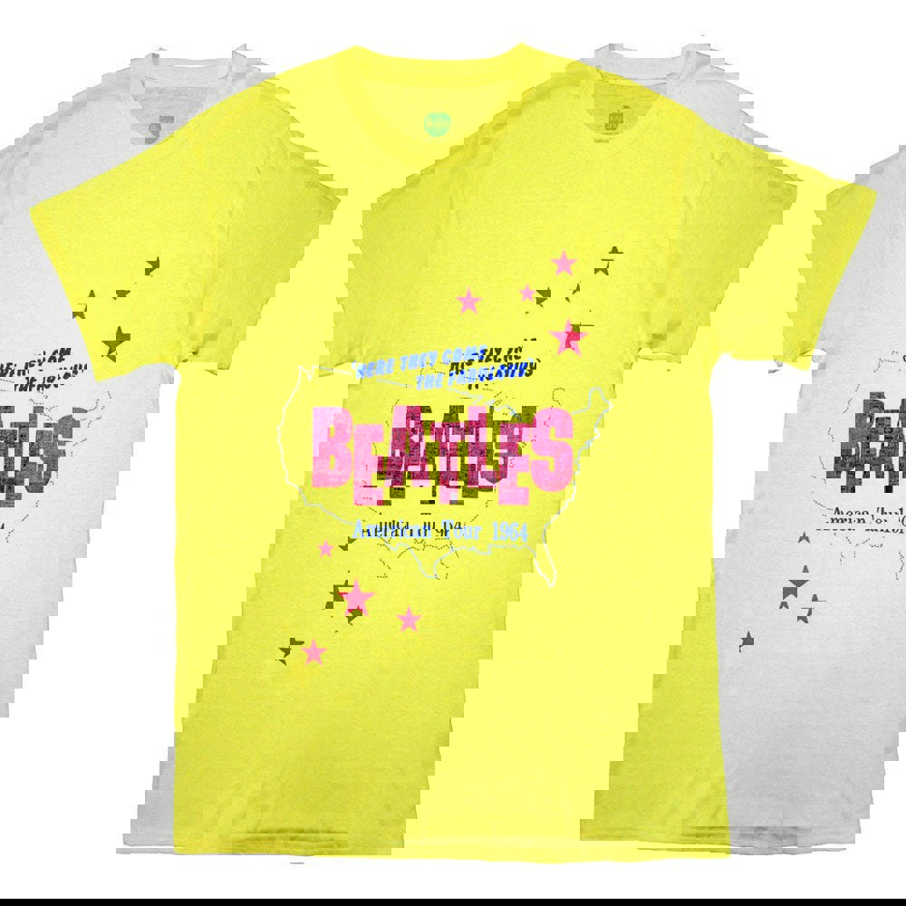 Official licensed The Beatles Unisex T-Shirt featuring the 'American Tour '64' design motif. High quality yellow unisex t-shirt featuring front and back printed design motif. Comes in a wide range of sizes from Small through XX-Large, subject to availability.