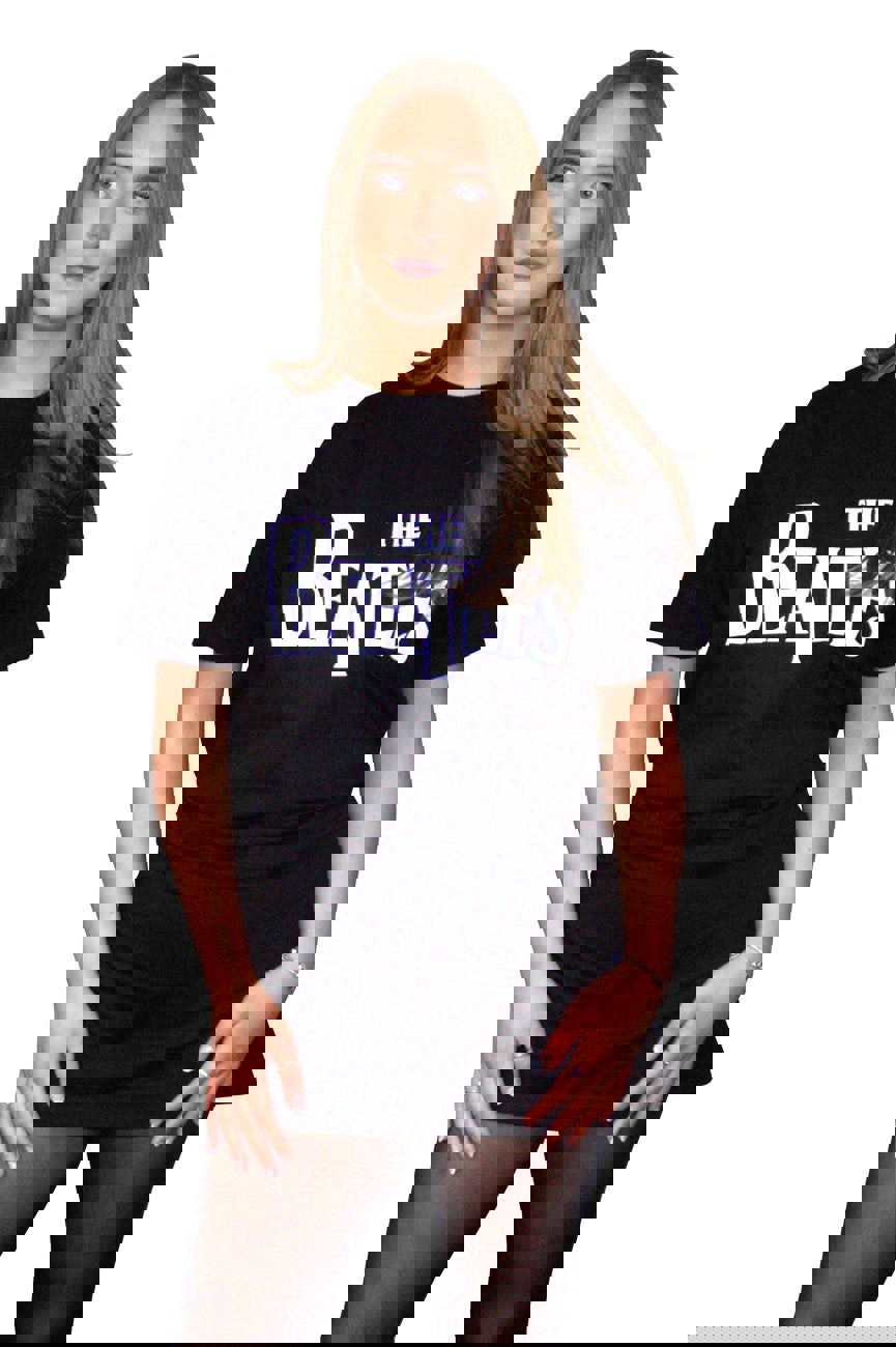 Official licensed The Beatles Ladies T-Shirt Dress featuring the 'Drop T' design motif. High quality T-Shirt Dress available in a black colourway. High quality soft-style cotton ladies t-shirt dress featuring front printing. Comes in a wide range of sizes from XX-Small through XX-Large, subject to availability.