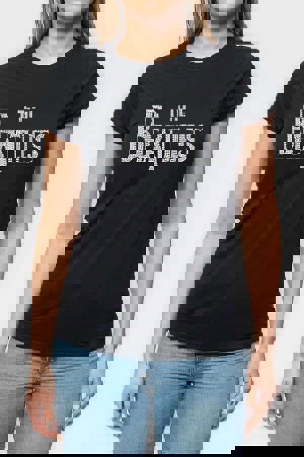 An official licensed The Beatles Ladies Embellished T-Shirt featuring the 'Drop T Logo' design motif. This high quality Embellished T-Shirt is available in a black colourway. High quality embellished ladies t-shirt featuring rhinestones, crystals, studs or beads. Printing to front. The t-shirt blank is manufactured using aterials comprising 60% Cotton and 40% Polyester. Comes in a wide range of sizes from Small through XX-Large, subject to availability.