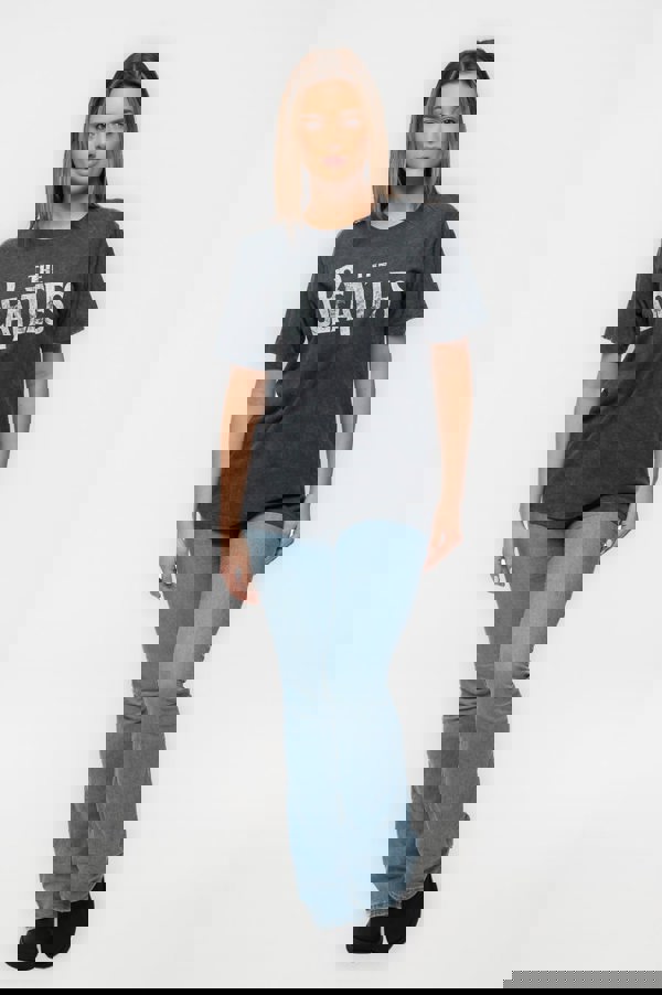 An official licensed The Beatles Unisex T-Shirt featuring the 'Drop T Logo' design motif. This high quality T-Shirt is available in a charcoal grey colourway. Unisex crew neck t-shirt with snow washed finish, raw edge panel, contrast chain stitch and print detail on chest. Resulting in a vintage, retro look. Comes in a wide range of sizes from Small through XX-Large, subject to availability.