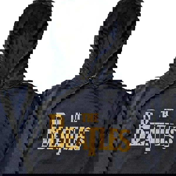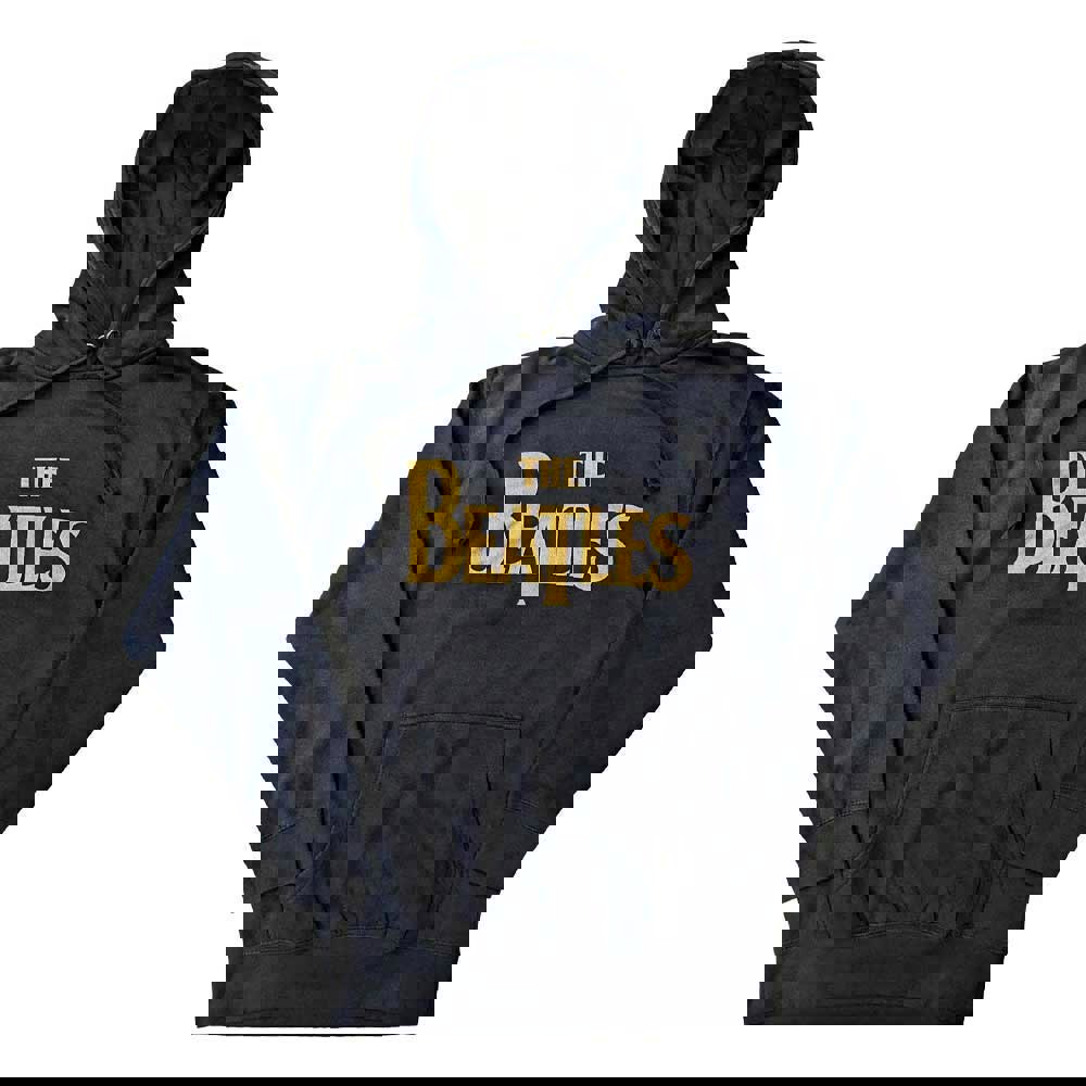 An official licensed The Beatles Unisex Pullover Hoodie featuring the 'Gold Drop T Logo' design motif. This high quality Pullover Hoodie is available in a navy blue colourway. High quality cotton pullover hoodie, featuring drawstring hood, kangaroo style pouch pocket and front printing. Comes in a wide range of sizes from Small through XX-Large, subject to availability.