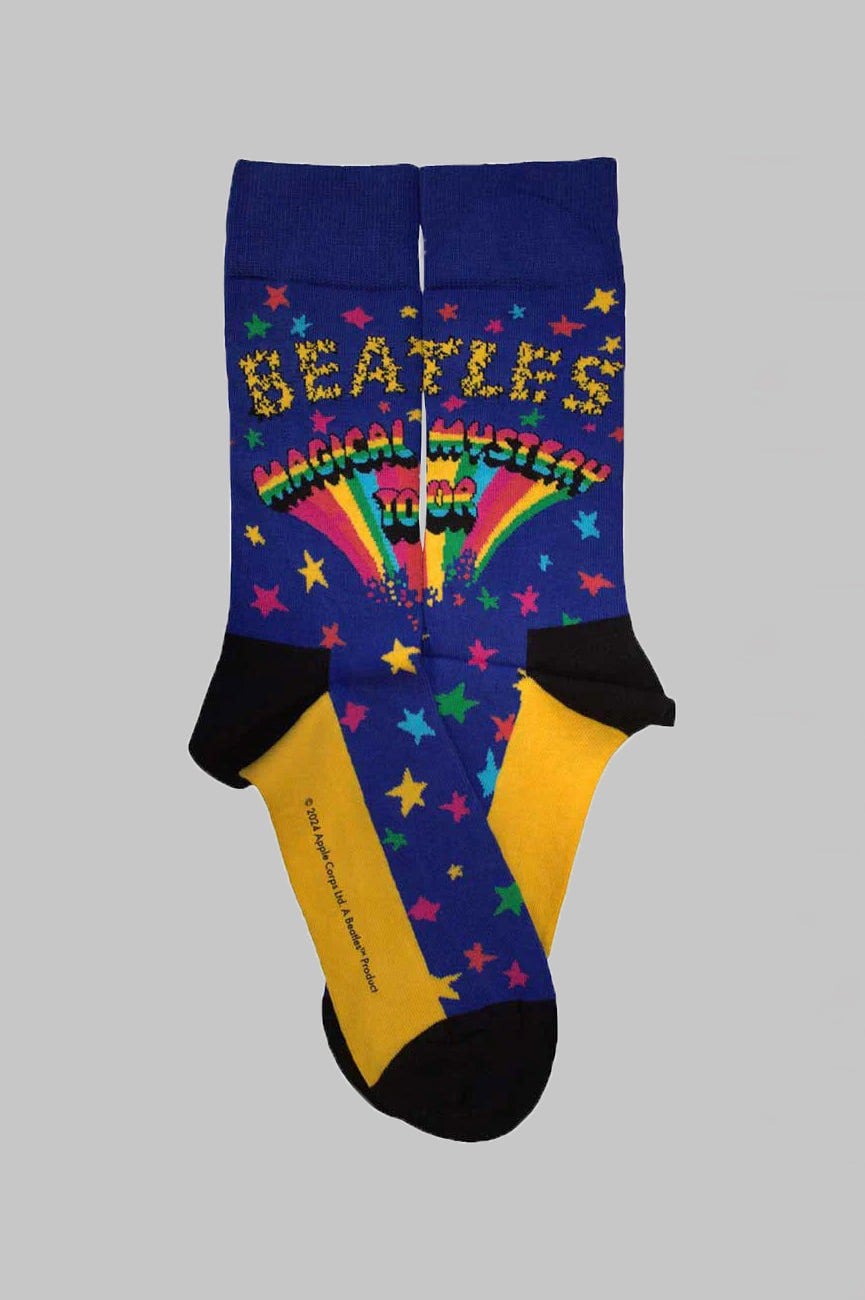 Official licensed The Beatles Ankle Socks featuring the 'Magical Mystery Tour' design motif. High quality Ankle Socks available in a blue colourway. High quality 86% cotton, 12% polyamide, 2% elastane ankle socks featuring an all-over pattern and cotton rich. These woven socks are guaranteed to stand out in the crowd.