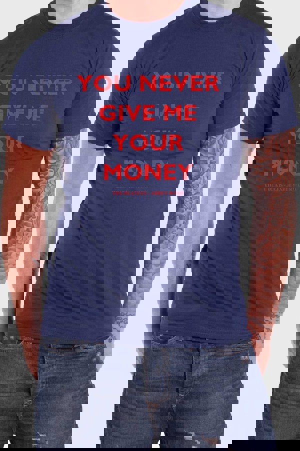 An official licensed unisex soft-style cotton Tee featuring The Beatles 'You Never Give Me Your Money' design motif. This high quality t-shirt is available in a navy blue colourway. Features front and back. We offer a range of sizes from Small through XX-Large, subject to stock availability. print.