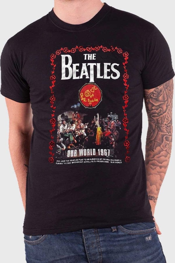 An official licensed The Beatles Unisex T-Shirt featuring the 'Our World 1967' design motif. This high quality T-Shirt is available in a black colourway. A high quality soft-style cotton t-shirt with short sleeves and crew neck. Features front printing. Comes in a wide range of sizes from Small through XX-Large, subject to availability.