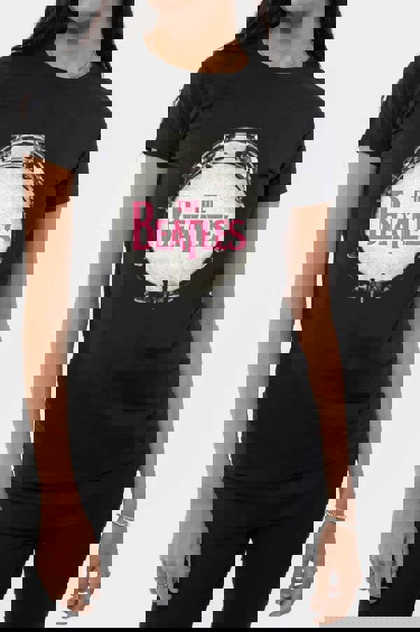 This Brand New Official The Beatles T Shirt with a Drop T Drum Pink Glitter Print Logo Design on a Womens Black Short Sleeve Crew Neck Skinny Fit T ShirtThis is the perfect gift for any fan.