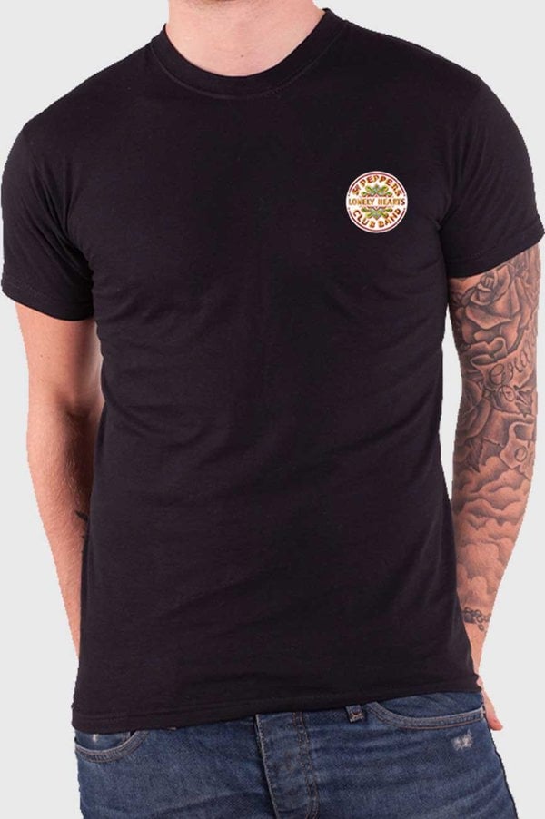 An official licensed unisex soft-style cotton Tee featuring The Beatles 'Sgt Pepper' design motif. This high quality t-shirt is available in a black colourway. Features front and back print. Supplied in a wide range of sizes from small through xx-large, subject to availability.