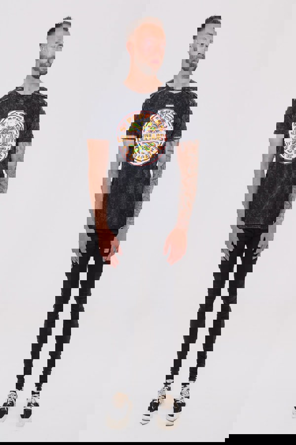 An official licensed The Beatles Unisex Snow Wash Tee featuring the 'Sgt Pepper Drum' design motif. This high quality t-shirt design is available in the black colourway.