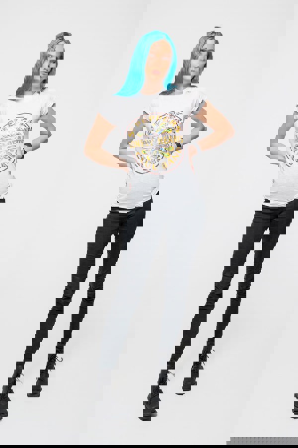 This Brand New Official The Beatles T Shirt with a Sgt Pepper Lonely Hearts Logo Foil Print Application Design on a Womens White Short Sleeve Crew Neck Skinny Fit T ShirtThis is the perfect gift for any fan.