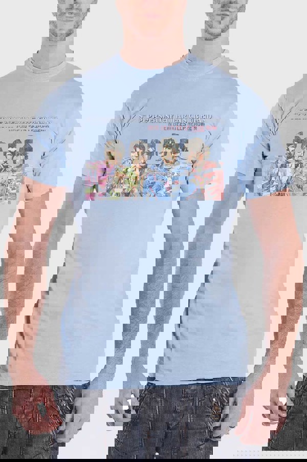 This Brand New Official The Beatles T Shirt with a Sgt Pepper Lonely Hearts LP Here Now Design on a Mens Black Short Sleeve Crew Neck T ShirtThis is the perfect gift for any fan.