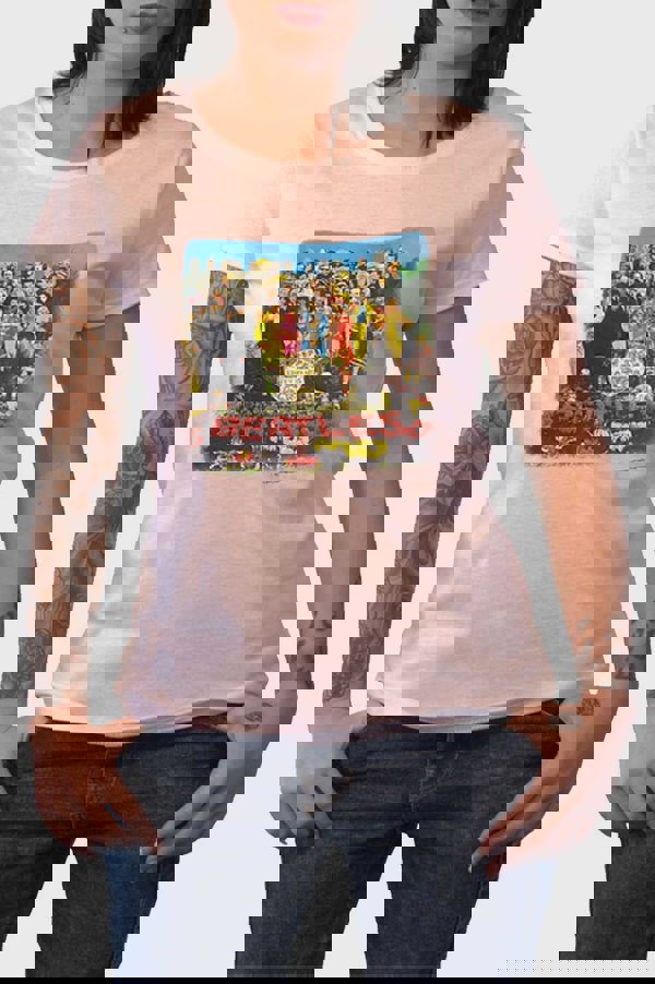 New and official band merchandise The Beatles womens skinny fit T shirt showcasing the cover art of their eight studio album Sgt Pepper printed on a 100% cotton short sleeve Shirt