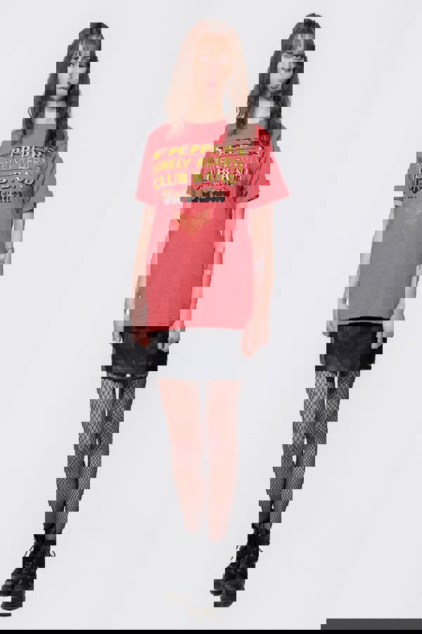 An official licensed The Beatles Unisex T-Shirt featuring the 'Sgt Pepper Stacked' design motif. This high quality T-Shirt is available in a red colourway. Eye catching, high quality soft-style cotton/poly tee. With short sleeves, crew neck and front screen printing. Features diamante embellishments. Sgt Pepper's Lonely Hearts Club Band was released on the 1st June 1967. It's viewed as being the most important rock and roll album of all time. 60% Cotton, 40% Polyester. Machine cold wash (30 degrees), wash inside out, don't bleach, dry low, don't iron decoration. Comes in a wide range of sizes from Small through XX-Large, subject to availability.