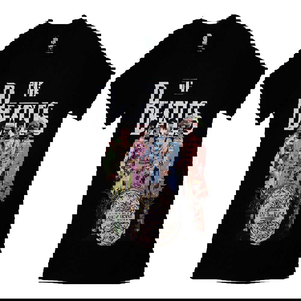 An official licensed The Beatles Ladies T-Shirt featuring the 'Sgt Pepper' design motif. This high quality T-Shirt is available in a black colourway. High quality soft-style cotton ladies t-shirt featuring front printing. Comes in a wide range of sizes from Small through XX-Large, subject to availability.