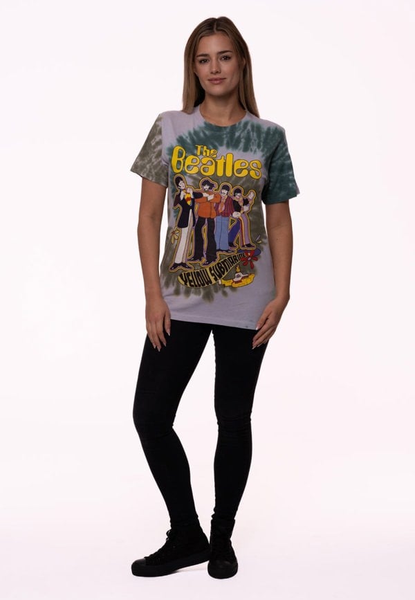 Official licensed The Beatles Unisex T-Shirt featuring the 'Yellow Submarine Band In Line' design motif. High quality T-Shirt available in a white colourway. High quality cotton & polyester unisex t-shirt featuring front printing on dip dye retro style design. Comes in a wide range of sizes from Small through XX-Large, subject to availability.