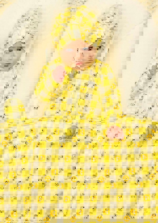 This baby girls turban hat from The Bonnie Mob comes in yellow with tiddlywink patterning. It has a cotton face and reflects the brand’s focus on sustainable aesthetics and modern technology.