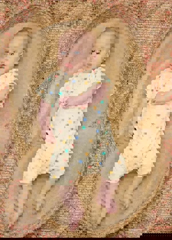 The Bonnie Mob Dinky Rainbow Sunshine Short Sleeve Playsuit is a baby shorts onesie with a rainbow sunshine print, designed for everyday wear and easy changes. Made from organic cotton, it’s a thoughtful newborn gift and a practical choice for warm-weather dressing or layering.
