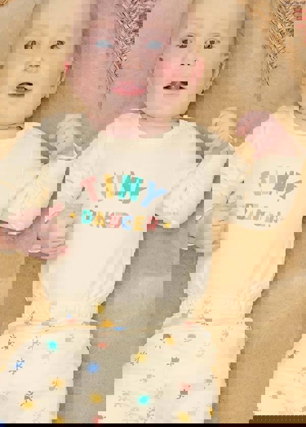 Adorable long sleeved organic cotton baby bodysuit with a unisex TINY DANCER design, the perfect newborn baby gift. Made from ultra soft GOTS certified organic cotton. Press studs at the shoulder and crotch make dressing and diapering nice and easy. This sustainable baby romper is perfect for layering; add the matching rainbow sunshine baby leggings and a space dye cardigan for a super cute infant outfit.