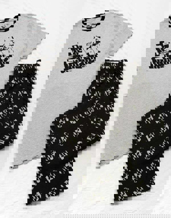 The PJs set includes a grey t-shirt that features the iconic movie logo with matching all-over print black trousers, making them impossible to miss
