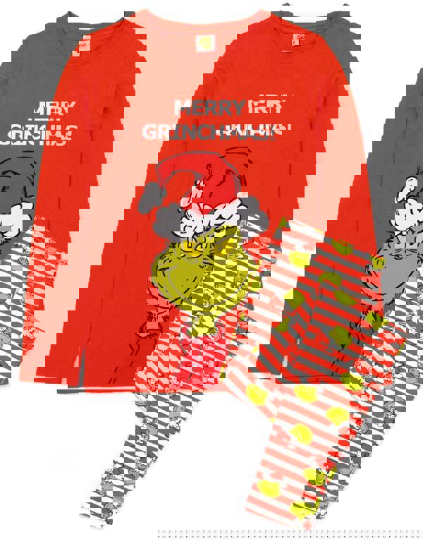 The red or blue long sleeve top features the one who stole Christmas, the Grinch, with the fun quote "Merry Grinchmas" matched with candy-cane striped bottoms