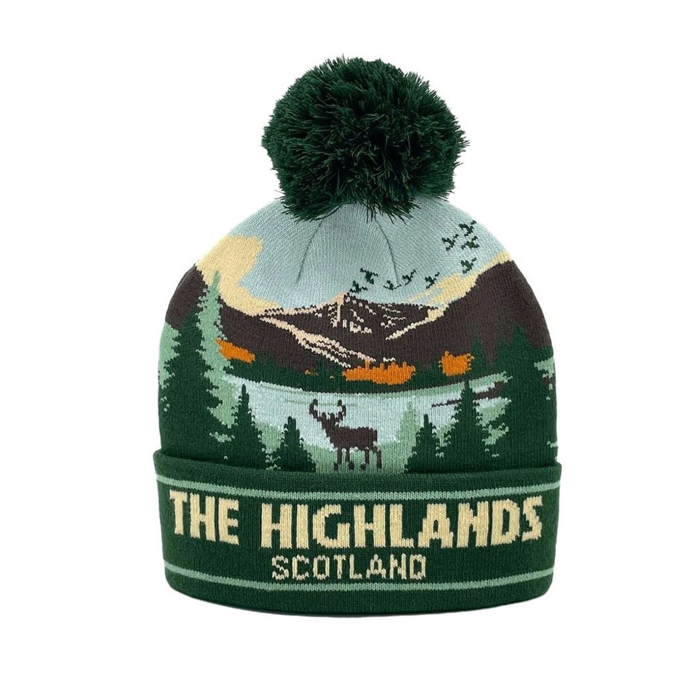Made from 100% acrylic for a soft and snug fit, this stylish bobble hat features a green pom pom on top and a green knit body with a beautiful illustration of the Scottish Highlands, complete with the word ‘The Highlands, Scotland’ boldly displayed across the front.