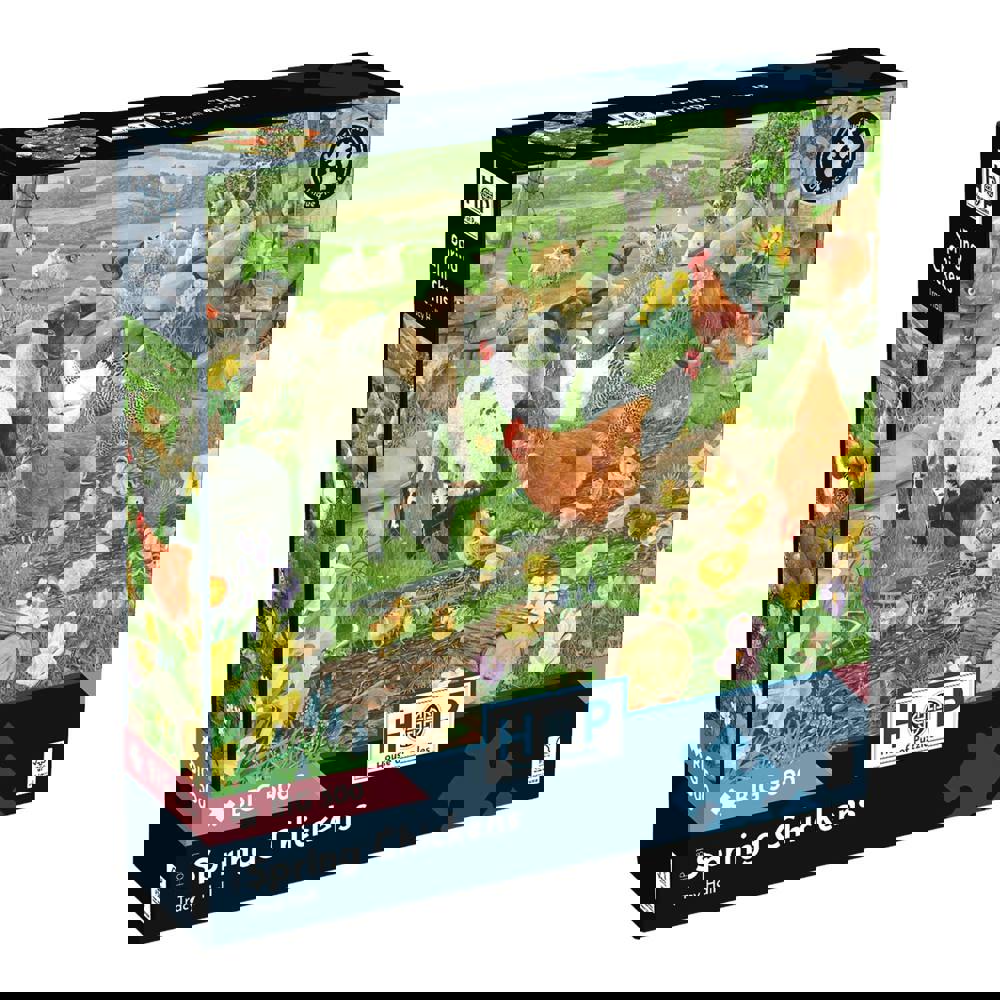 This is the Spring Chickens BIG 500 Puzzle, featuring art by Tracy Hall. It is a BIG 500 piece jigsaw puzzle, meaning the pieces are larger for easier handling. This premium quality The House of Puzzles farm theme puzzle is made from FSC® Certified board and measures 48 x 69cm when completed. A delightful way to spend a cosy afternoon.