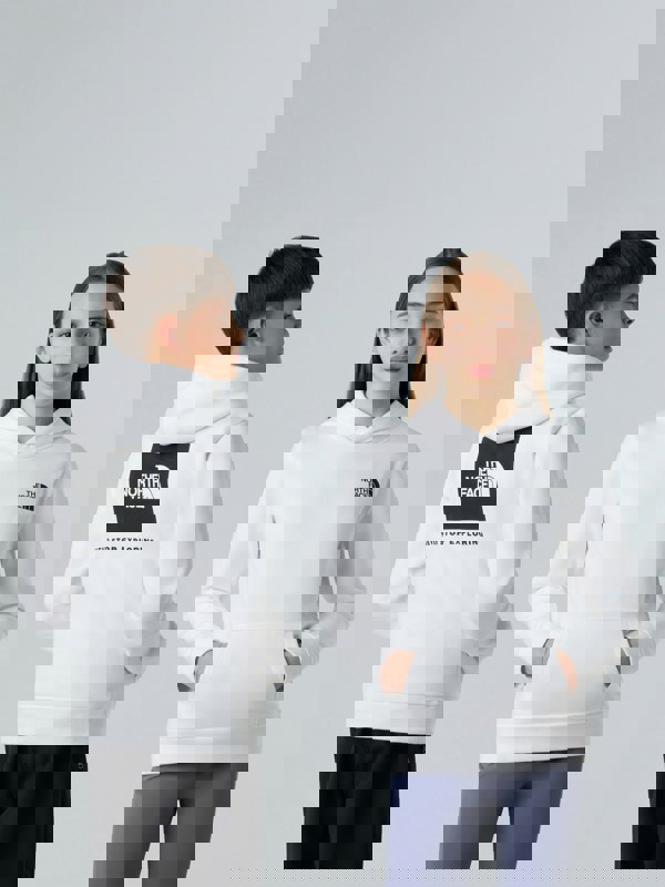 The North Face Kids Box NSE regular hoodie in white is made from soft, fleecy cotton with ribbed cuffs. A hood and kangaroo pocket keep the design practical for casual days and easy-going activities. The front and back carry The North Face logo for a branded finish.