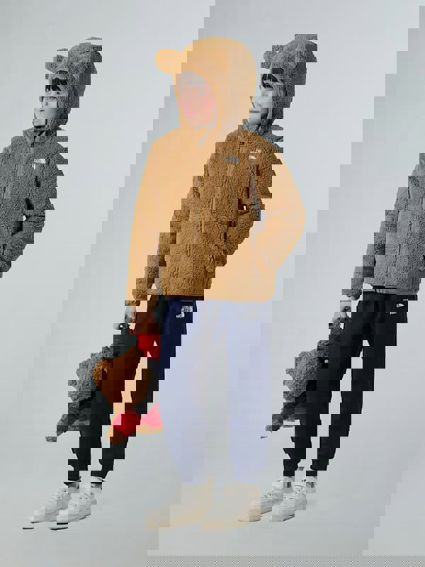The North Face Kids Campshire full-zip hoodie in brown brings a teddy-style look to a practical layer. Made from recycled fleece fabric, it has a relaxed fit and a three-piece hood. Teddy bear ears in self-fabric add a playful finish, while open hand pockets keep the front clean and functional. Part of a sustainable design initiative, this piece is made from 100% polyester.