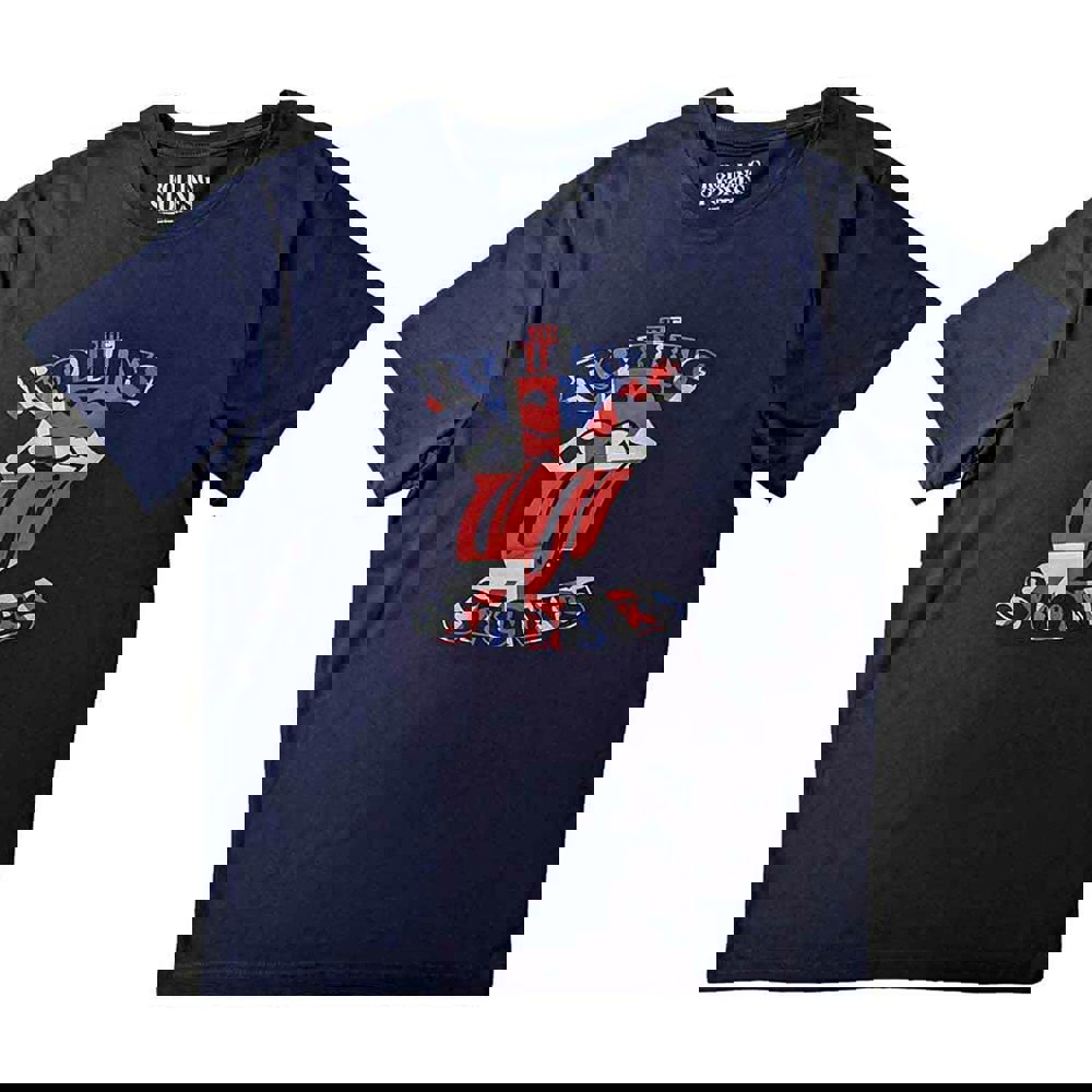 An official licensed unisex soft-style cotton Tee featuring the Rolling Stones 'British Flag Tongue' design motif. This high quality t-shirt is available in a navy blue colourway. Available in a wide range of sizes from small through xx-large, subject to availability.