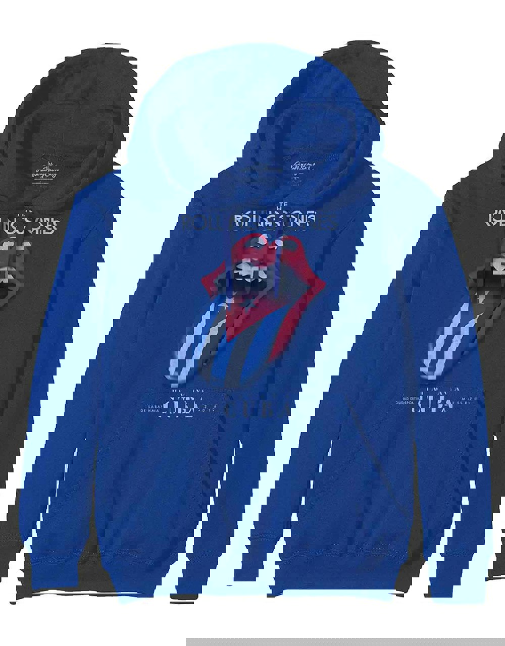An official licensed cotton Pullover Hoodie featuring The Rolling Stones 'Havana Cuba' design motif. This high quality garment is available in a blue colourway. Classic fit cotton pullover hoodie featuring pouch pockets. Comes in a wide range of sizes from X-Small through XX-Large, subject to availability.
