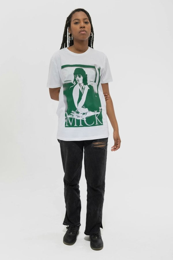 New and official band merchandise The Rolling Stones mens T shirt Tee showing the 'Mick Photo Version 1' design. This high-quality t-shirt is available in a white colourway. Size options include Small through XX-Large.