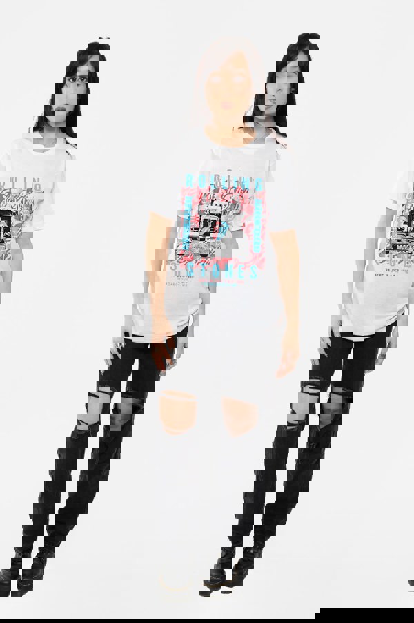 An official licensed The Rolling Stones Unisex T-Shirt featuring the 'Steel Wheels' design motif. This high quality T-Shirt is available in a white colourway. High quality classic soft-style cotton tee featuring front printing, short sleeves and crew neck. Comes in a wide range of sizes from Small through XX-Large, subject to availability.