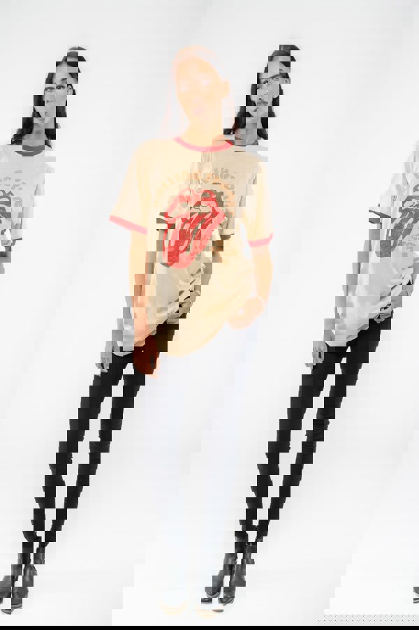 An official licensed The Rolling Stones Unisex Ringer T-Shirt featuring the 'US Tour '78' design motif. This high quality Ringer T-Shirt is available in a natural & orange colourway. High quality classic fit soft-style cotton tee with short sleeves and crew neck. Features front printing and contrast colours to neck and sleeve edging which adds a subtle but eye catching look. Comes in a wide range of sizes from Small through XX-Large, subject to availability.