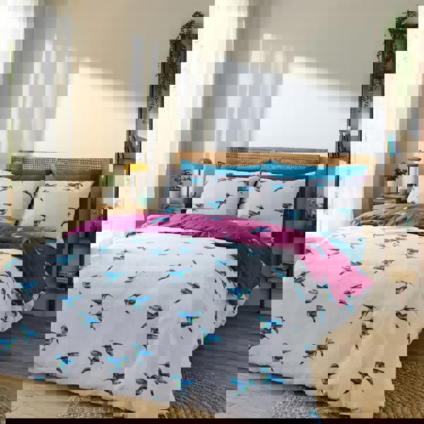 Surround yourself with the beauty of nature with this enchanting hummingbird bedlinen set, designed to bring a touch of vibrant charm to your space. The deep plum front, scattered with delicate hummingbirds in flight, adds a bold yet soothing aesthetic, while the clean white reverse offers a lighter, airy feel with a playful touch. Crafted from 100% cotton, this bedlinen set is beautifully soft, breathable, and gentle on your skin—keeping you cool and comfortable all night long.