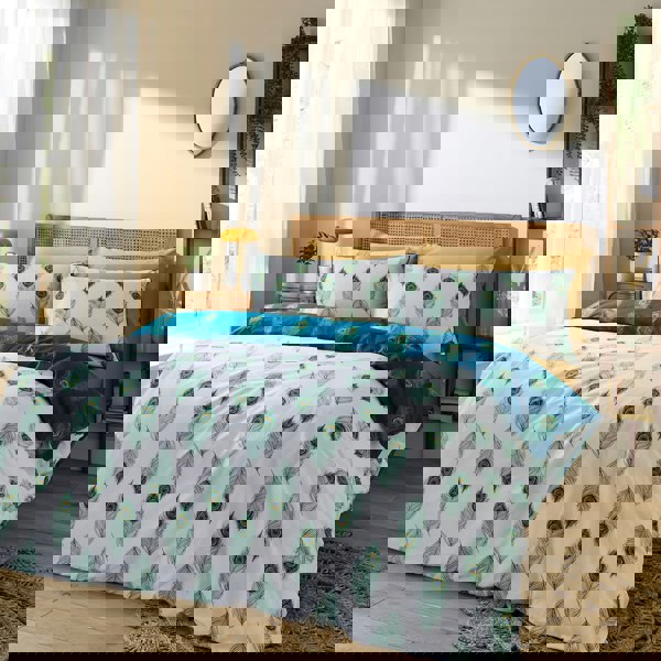 Drift off into a world of elegance with this peacock feather bedlinen set, designed to bring a touch of timeless charm to your bedroom. The rich teal front, adorned with intricate feather motifs, creates a sense of opulence, while the clean white reverse with delicate feather detailing offers a fresh and versatile look. Crafted from 100% cotton, this bedlinen set is beautifully soft, breathable, and gentle on your skin—keeping you cool and comfortable all night long.