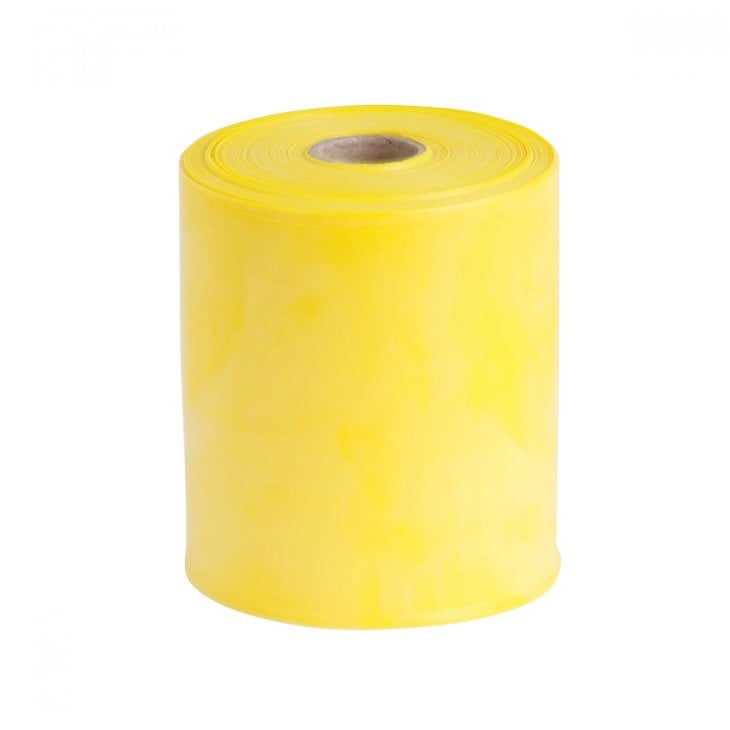 The resistance band is a great alternative to free weights like dumbbells and because it is lightweight it is easy to store and transport. This yellow coloured band is available to buy in different lengths: 1m, 1. 5m, 2m, 3m, 4m, 5m cut from a dispenser roll. The bands come as straight strips but can easily be knotted to form loops. It is made from high quality latex rubber and is approx 12. 5cm wide.