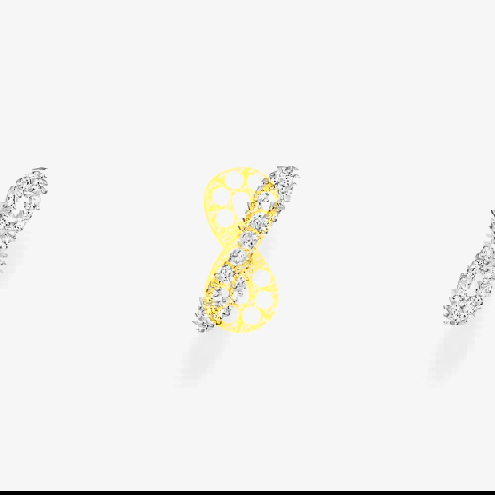 Infinity Love: This single earring stud symbolizes eternal love which has been handcrafted in sterling silver with 18ct yellow gold plating and gleaming French set white cubic zirconia stones. It perfectly fits trendy combinations with further ear studs, hoop earrings and ear cuffs to create your own look dependent on outfit or mood.