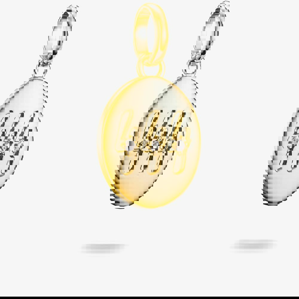 This round dangle charm features the powerful angel number 444, a symbol of protection, stability, and inner strength. Sparkling white cubic zirconia stones surround the number, adding a touch of brilliance to its meaningful design. Crafted from 18ct gold-plated recycled 925 sterling silver, this charm brings both elegance and spiritual significance to your look, perfect for those who value guidance and grounding energy.