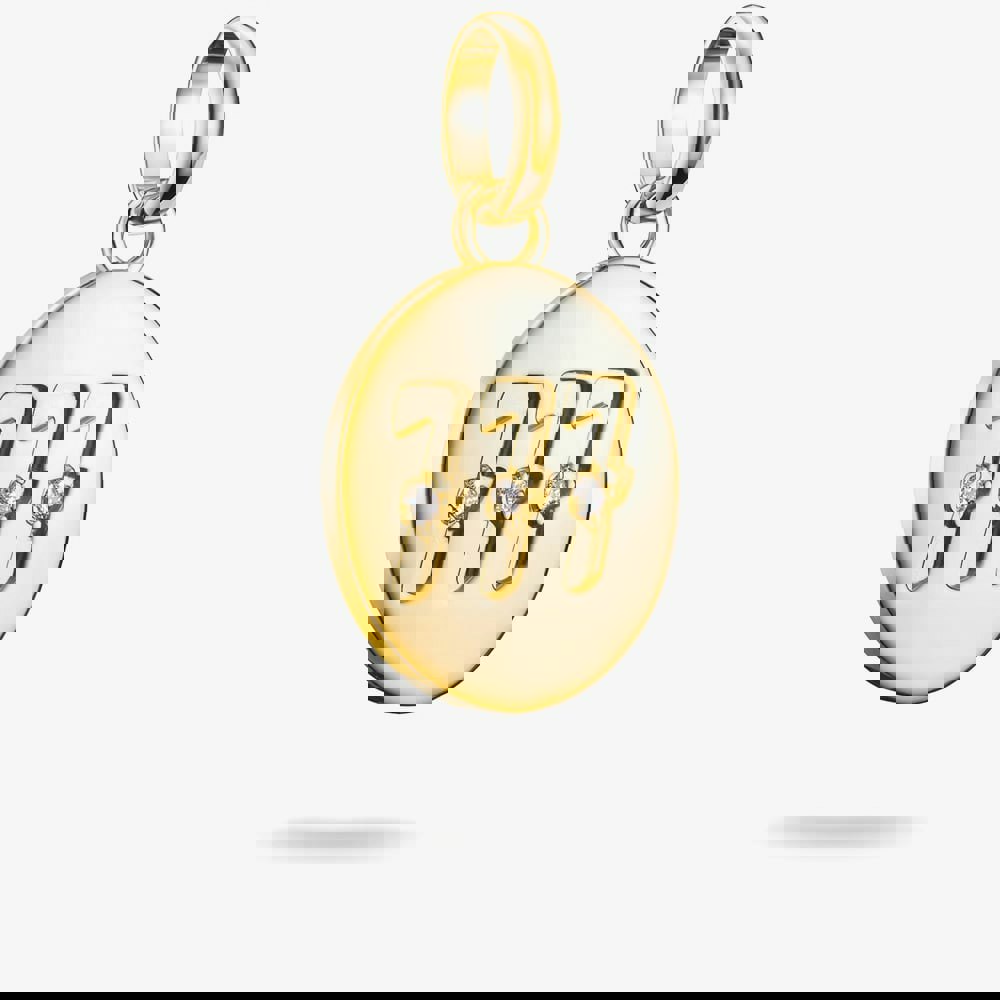 This round 777 angel number dangle charm is a symbol of spiritual alignment, intuition, and divine guidance. Framed with white cubic zirconia stones, it sparkles with both elegance and meaning. Expertly crafted from 18ct gold-plated recycled 925 sterling silver, this charm is a radiant reminder to trust the path you're on.
