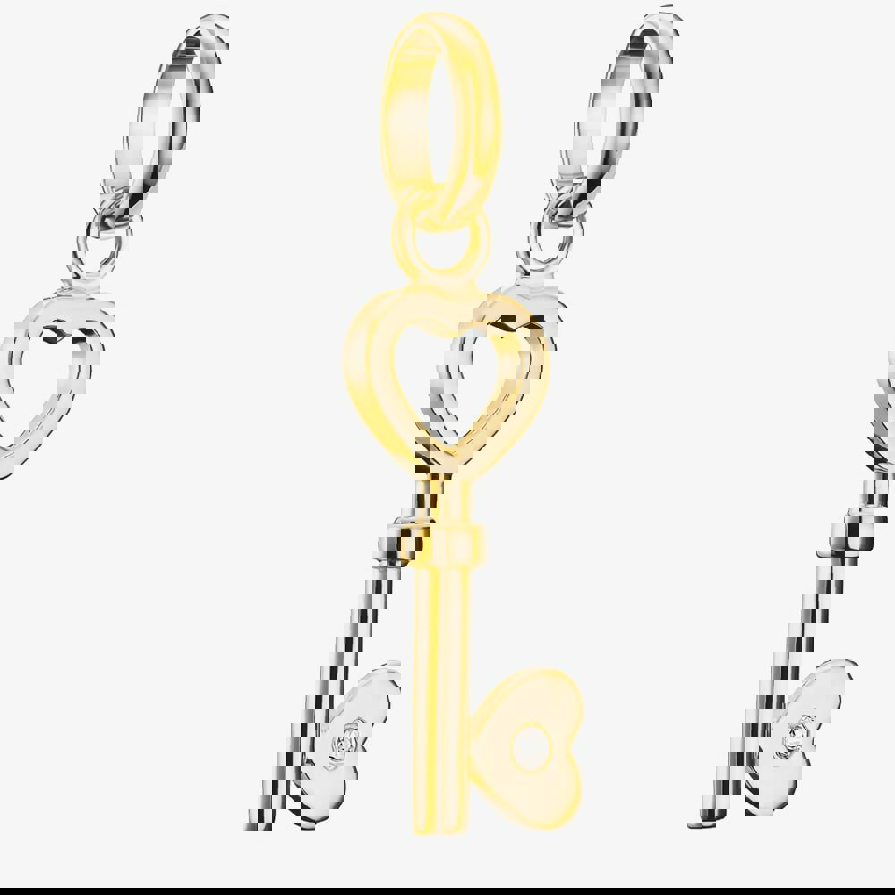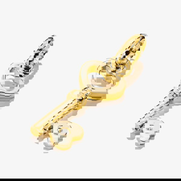 This elegant dangle charm features an open heart key design, symbolising love, trust, and new beginnings. A white cubic zirconia stone sits at the base, adding a subtle touch of sparkle and charm. Beautifully crafted from 18ct gold-plated recycled 925 sterling silver, it’s a meaningful and stylish addition to your look, perfect for unlocking personal expression and heartfelt connections.