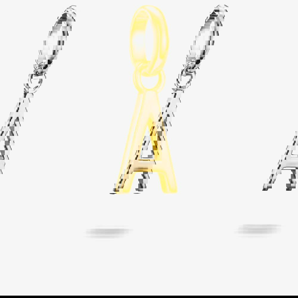 This dangle charm, beautifully crafted from 18ct gold-plated recycled sterling silver, features the letter A, adding a refined and personal touch to your jewellery collection. Its elegant design and luxurious gold plating make it the perfect piece for showcasing initials, names, or meaningful symbols on your necklace or bracelet. A timeless and sophisticated accessory that adds both style and sentiment to any look.