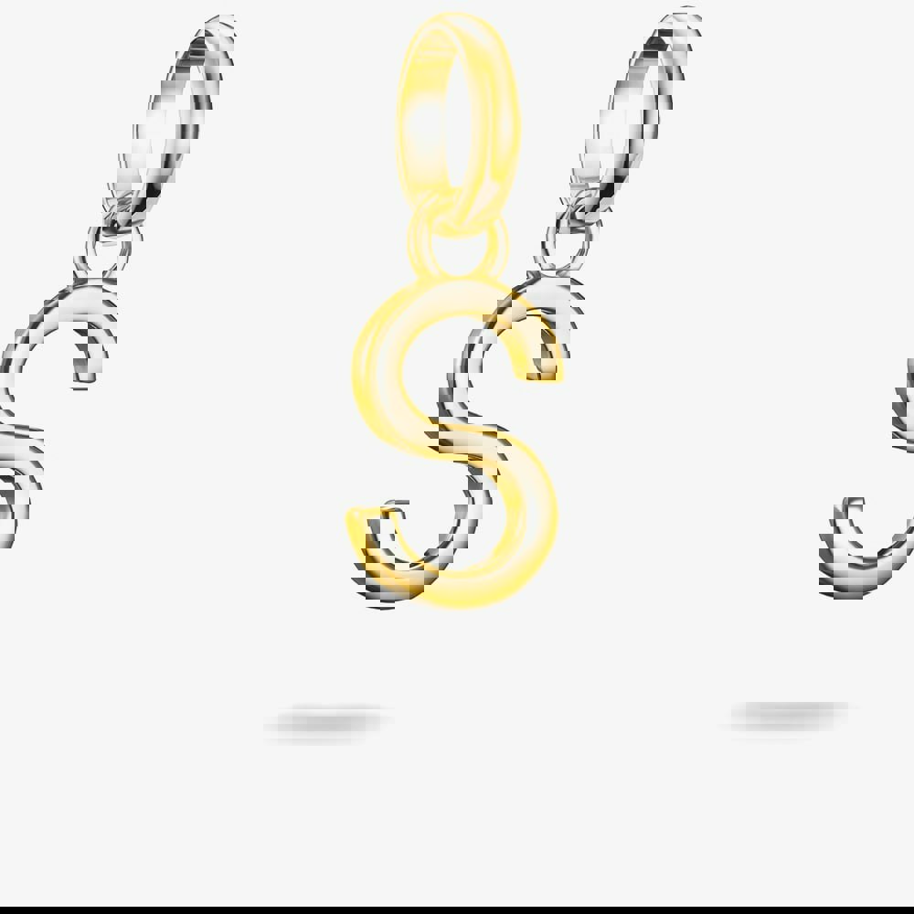 This dangle charm, beautifully crafted from 18ct gold-plated recycled sterling silver, features the letter S, adding a refined and personal touch to your jewellery collection. Its elegant design and luxurious gold plating make it the perfect piece for showcasing initials, names, or meaningful symbols on your necklace or bracelet. A timeless and sophisticated accessory that adds both style and sentiment to any look.