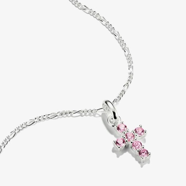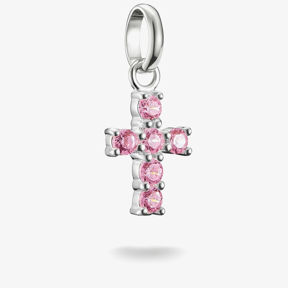 This recycled 925 sterling silver dangle charm features a modern cross design, beautifully enhanced with pink cubic zirconia stones for a touch of vibrant elegance. A perfect symbol of faith and love, this charm adds a delicate pop of colour to your look, making it a meaningful and stylish addition to any jewellery collection.