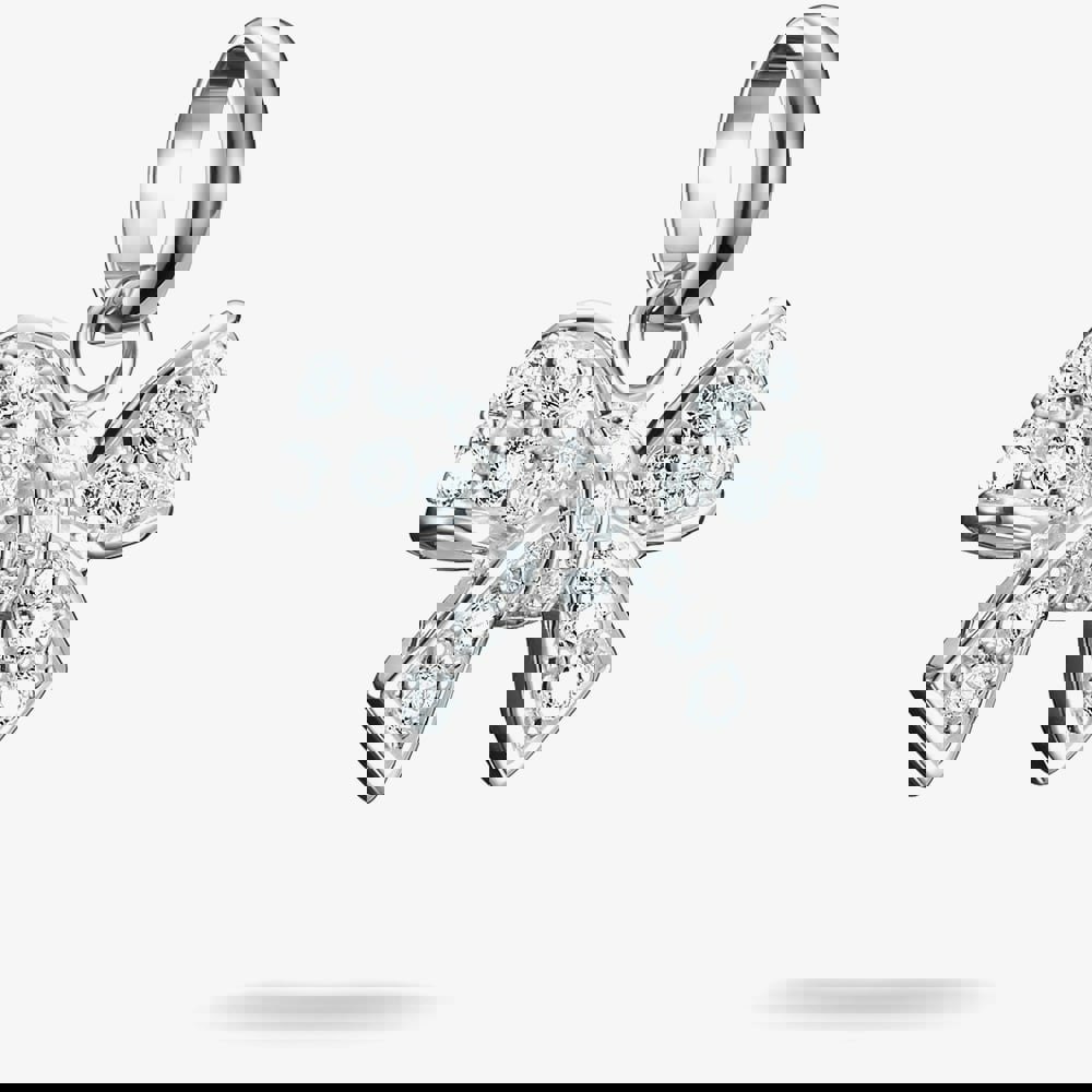 Delicately crafted from recycled 925 sterling silver, this dangle charm features a graceful bow design, symbolising elegance and the beauty of connection. Accented with white cubic zirconia stones, it adds a subtle sparkle to your look. A timeless piece perfect for adding a touch of femininity and sophistication to your jewellery collection.