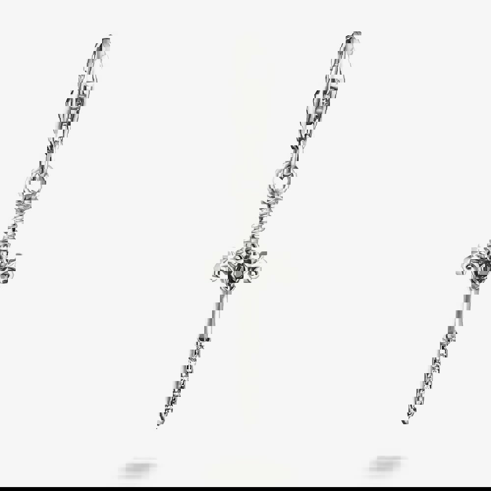 The Thomas Sabo True Romance Sword Charm is crafted from recycled sterling silver and features a gothic-style sword with a blackened finish. The handle is set with a black cubic zirconia, while the blade is adorned with sparkling white cubic zirconia. Merging Victorian symbolism with modern elegance, it embodies the romantic Gothic spirit of the True Romance collection and is compatible with both Charm Club and Charm Club Connect.
