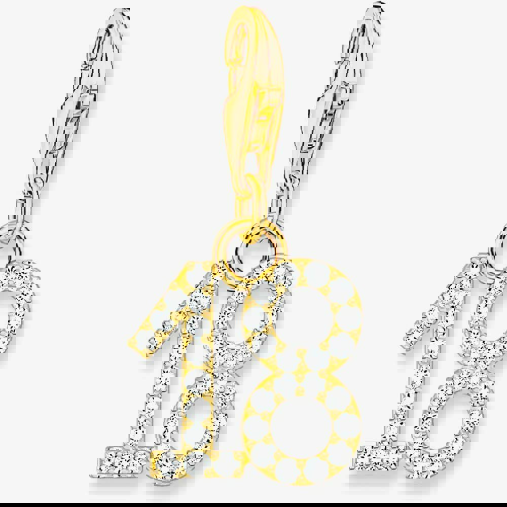This charm, designed for your 18th birthday, serves as a reminder of these special thoughts and feelings. Crafted from recycled silver with 18ct gold plating, it takes the shape of the number 18 and is adorned with sparkling white zirconia stones.