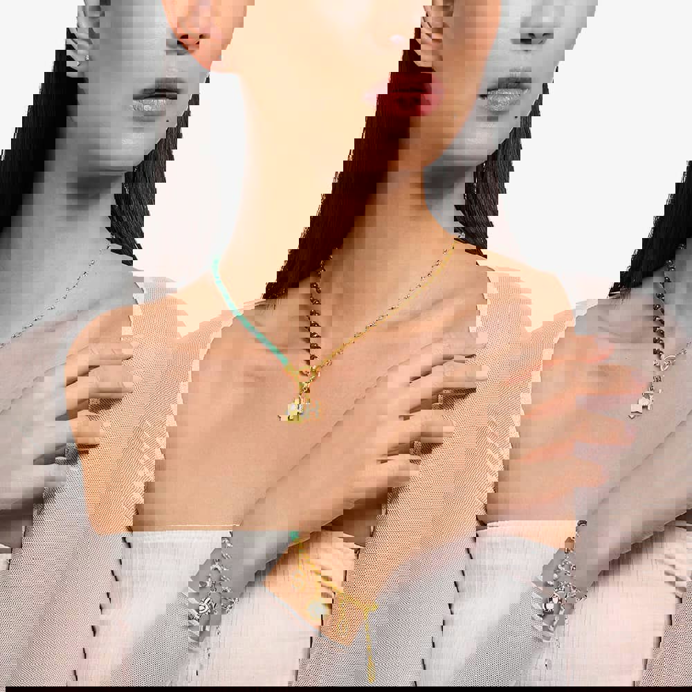 A delightful combination of a high-quality 925 Sterling silver link in 18k gold plated necklace with green malachite imitation beads. The link chain is adorned with a round THOMAS SABO Charm Club Charmista Coin, hand-painted with sparkling green cold enamel. The beads necklace features intricately designed end caps with engraved lines.