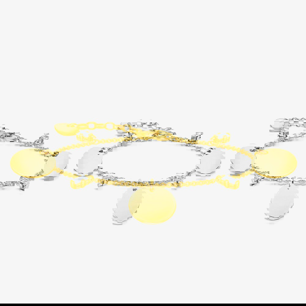 Created in sterling silver with a glistening gold plating, this sleek bracelet is perfect for everyday wear. Three plain pendants decorate a delicate bracelet with four small zirconia stone elements that provide sparkling highlights. Add a personalised finish to the piece with engraving.